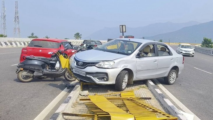மேலும் பின்னால் விஜய் என்பவர் ஓட்டி வந்த கார், முன்னால் விபத்துக்குள்ளான கார் மீது மோதாமல் இருப்பதற்காக திருப்பியபோது கட்டுப்பாட்டை இழந்த கார் சாலையோரத்தில் உள்ள தடுப்புகள் மீது மோதி விபத்துக்குள்ளானது.