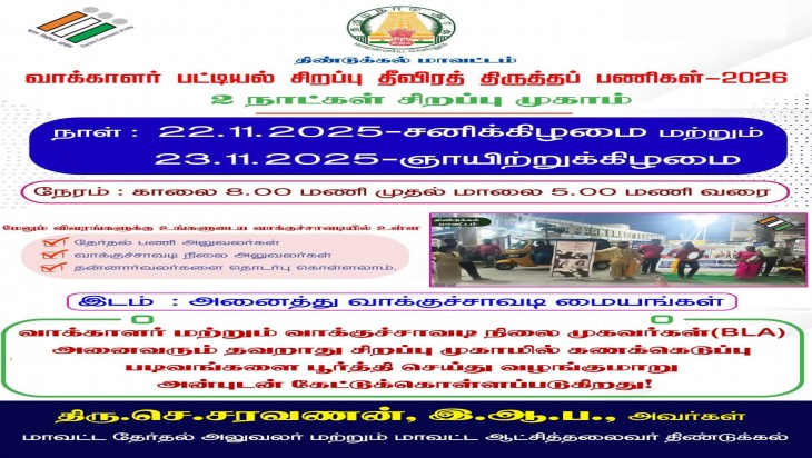 வாக்காளர் சிறப்பு தீவிர திருத்த பட்டியல் -2026 (SIR) கணக்கெடுப்பு படிவங்கள் பூர்த்தி செய்து திரும்ப பெறுவதற்கான சிறப்பு முகாம்கள் வருகின்ற 22 மற்றும் 23ஆம் தேதிகளில் சனி மற்றும் ஞாயிற்றுக்கிழமைகளில் திண்டுக்கல் மாவட்டத்தில் அனைத்து வாக்கு சாவடி நிலையங்களிலும் காலை 8:00 மணி முதல் மாலை 5 மணி வரை நடைபெறுகிறது. அனைத்து பொதுமக்களும் வாக்காளர்களும் வாக்கு சாவடி முகவர்களும் இந்த சிறப்பு முகாமை நன்கு பயன்படுத்திக் கொள்ளுமாறு மாவட்ட ஆட்சியர் கேட்டுக் கொண்டார்.