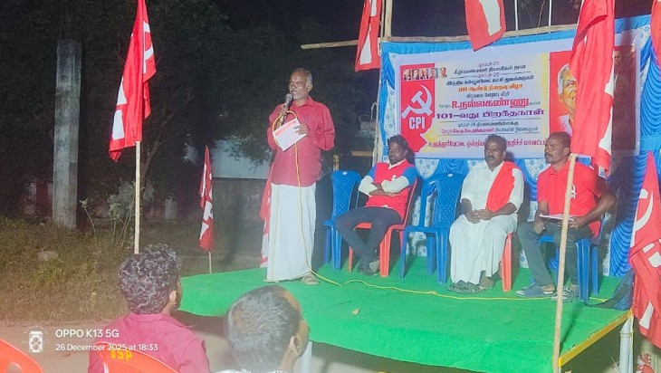 இந்திய கம்யூனிஸ்ட் கட்சியின் நூற்றாண்டு வரலாறு வெண்மணி தியாகிகள் நினைவு நாள் தோழர் ஆர் நல்லகண்ணு அவர்களின் 101 வது பிறந்த நாள் விழா,தியாகசெம்மல் கே.டி.கே தங்கமணி அவர்கள் நினைவு நாள் இயற்றின் நோக்கங்களை குறித்து பொதுக்கூட்டத்தில் சிபிஐ மாவட்ட நிர்வாக குழு உறுப்பினரும் தமிழ்நாடு ஒடுக்கப்பட்டோர் வாழ்வுரிமை இயக்க மாவட்ட செயலாளர் எம் வெங்கடேசன் சிபிஐ மாவட்ட செயலாளர் ராமசாமி ஆகியோர் பேசினார்கள்...