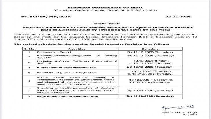 பூர்த்தி செய்யப்பட்ட SIR படிவங்களை ஒப்படைப்பதற்கான கால அவகாசம் டிச.11 வரை நீட்டிப்பு. டிச.4ம் தேதி இறுதி நாளாக முன்பு கூறப்பட்டிருந்தது. வரைவு வாக்காளர் பட்டியல் டிச. 16, இறுதி வாக்காளர் பட்டியல் பிப்14ம் தேதி வெளியிடப்படும் என தேர்தல் ஆணையம் அறிவிப்பு. இது தொடர்பாக தற்பொழுது எஸ் ஐ ஆர் நடைமுறை மேற்கொள்ளப்படும் தமிழ்நாடு உள்ளிட்ட மாநிலங்களின் தேர்தல் ஆணையர்களுக்கு கடிதம் எழுதப்பட்டுள்ளது.