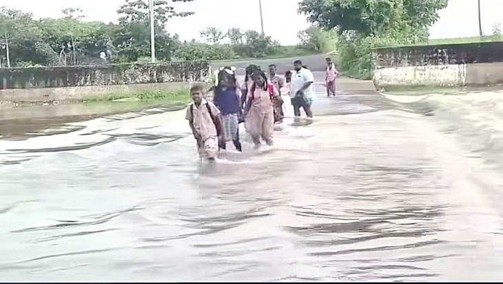 பள்ளி, கல்லூரி மற்றும் வேலைக்கு செல்லும் பொதுமக்கள் ஆபத்தை உணராமல் வெள்ள நீரில் கடந்து செல்கின்றனர்.