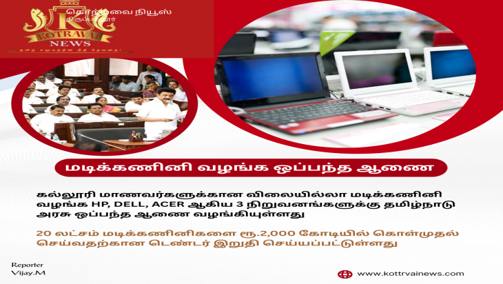 தமிழக அரசு மடிக்கணினி திட்டம், ஒப்பந்தம் ஆணை பிறப்பித்து உள்ளது.