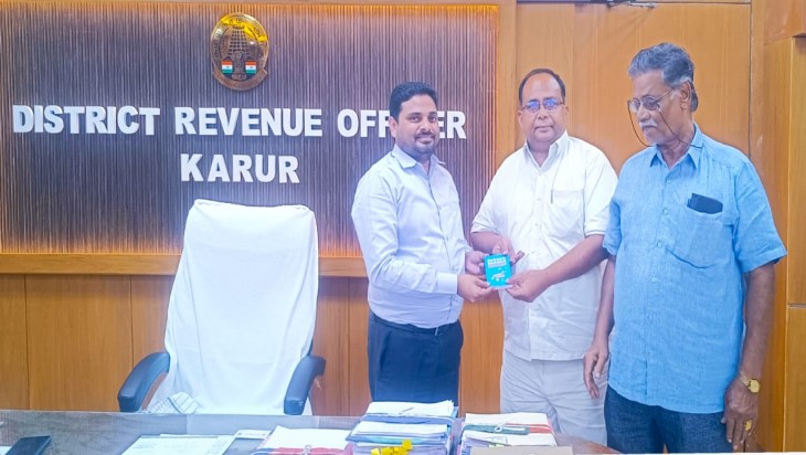 கரூர் மாவட்ட புதிய வருவாய் துறை அலுவலராக பொறுப்பேற்றுள்ள விமல் ராஜ் -க்கு கரூர் மாவட்ட வழக்கறிஞர் தமிழ் இராஜேந்திரன் மற்றும் ரெட் கிராஸ் ஜோசப் ஆகியோர் வருவாய்த்துறை அதிகாரியை நேரில் சந்தித்து, வாழ்த்து கூறி திருக்குறள் புத்தகம் அன்பளிப்பாக வழங்கினர்.