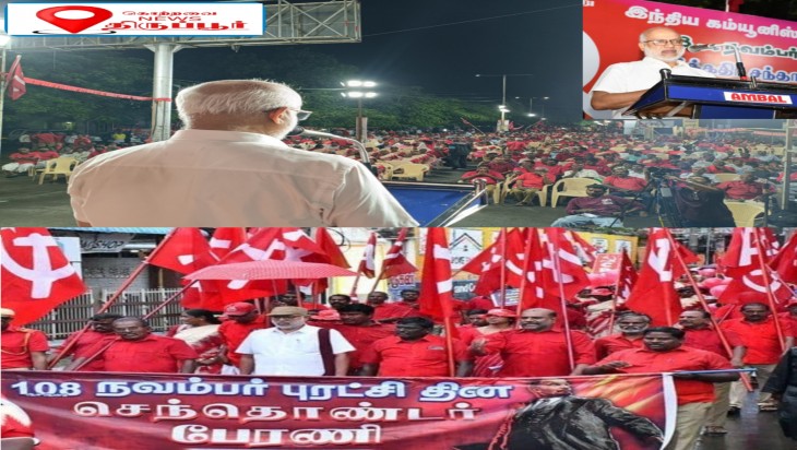 சோவியத் யூனியனில் நடந்த நவ., மாத புரட்சி வரலாற்றை விளக்கி பேசினார். தொடர்ந்து, சர்வதேச, இந்திய அரசியல் சூழல் மற்றும் தமிழகம் மற்றும் கேரள அரசு திட்டங்கள் குறித்தும் பேசினார்.