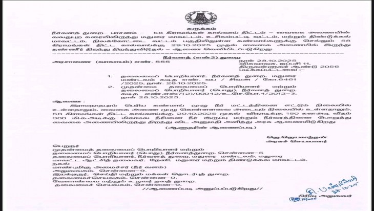 மதுரை மற்றும் திண்டுக்கல் மாவட்டங்களின் விவசாயிகளின் நீண்ட நாள் கோரிக்கையை நிறைவேற்றும் விதமாக, வைகை அணையில் இருந்து 58 கிராமத் திட்டக் கால்வாயில் இன்று (அக்டோபர் 29, 2025) நீர் திறக்கப்பட உள்ளது.