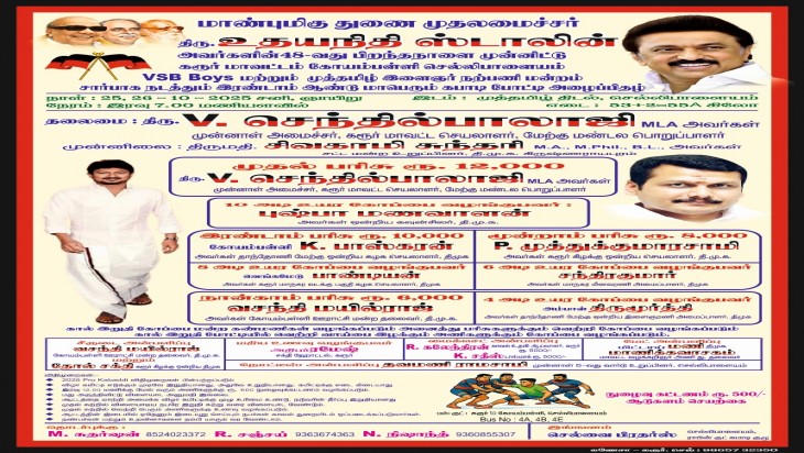 கரூர் மாவட்டம், தமிழக துணை முதலமைச்சர் உதயநிதி ஸ்டாலின் 48 வது பிறந்த நாளை முன்னிட்டு கரூர் மாவட்டம் கோயம்பள்ளி, செல்லிபாளையம் VSB பாய்ஸ் மற்றும் முத்தமிழ் இளைஞர் நற்பணி மன்றம் சார்பாக நடத்தும் மாபெரும் இரண்டாம் ஆண்டு கபடி போட்டி நடைபெறுகிறது. இந்நிகழ்ச்சியை மாவட்ட திமுக செயலாளர் செந்தில் பாலாஜி முன்னிலை வகிக்கிறார். போட்டியில் வெற்றி பெறுபவர்களுக்கு பரிசுகள் வழங்கப்படுகிறது.